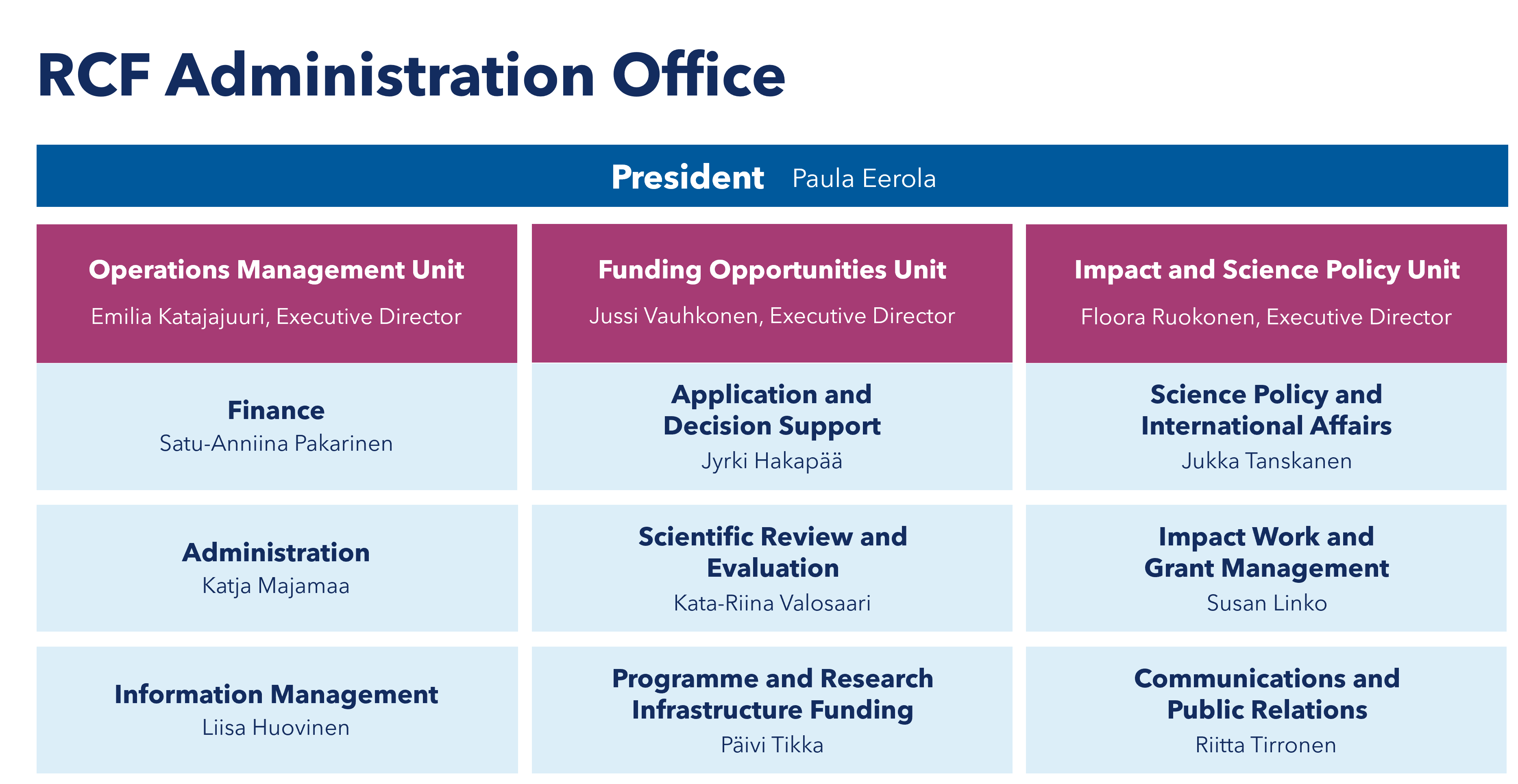 The President heads the day-to-day work at the Administration Office. The management also includes three executive directors. The organisation of the Administration Office consists of three units: the Operations Management Unit, the Funding Opportunities Unit and the Impact and Science Policy Unit.