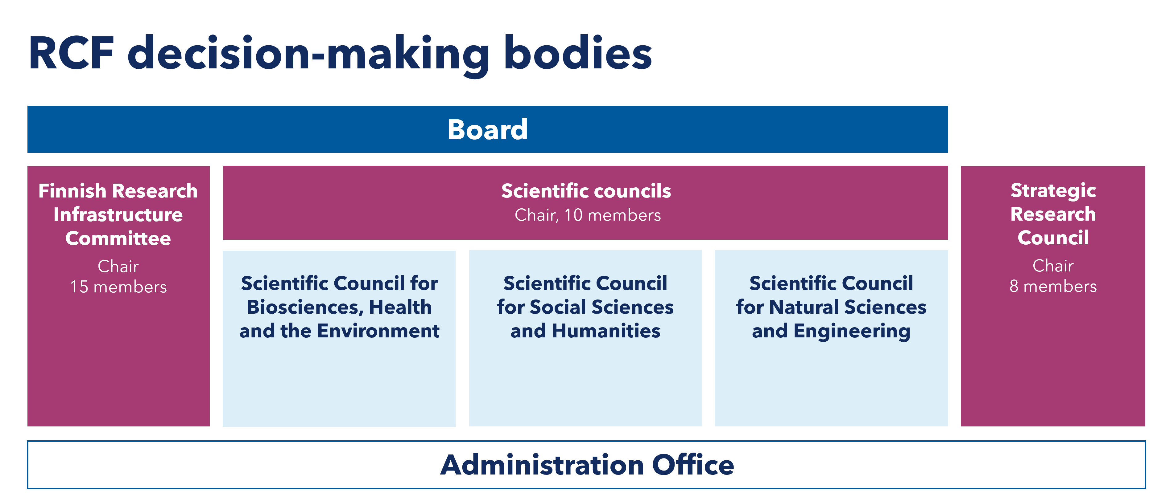 The Research Council of Finland consists of three scientific councils, the Finnish Research Infrastructure Committee, the Strategic Research Council and the Administration Office.