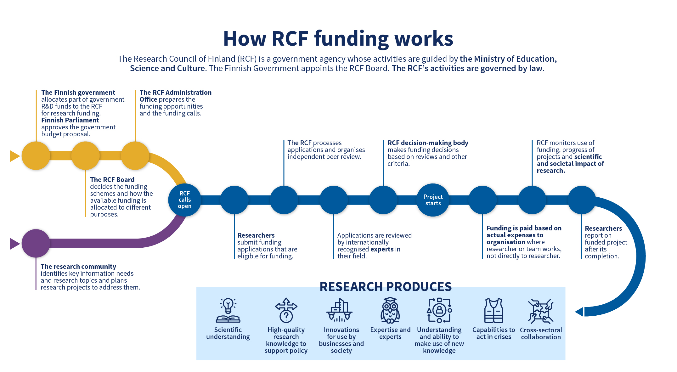 The Research Council of Finland (RCF) is a government agency whose activities are guided by the Ministry of Education, Science and Culture as part of the educational and cultural administration. The RCF’s research funding comes from the state budget. We have a unique position in Finland: we grant funding in all scientific disciplines based on open competition and independent peer review.