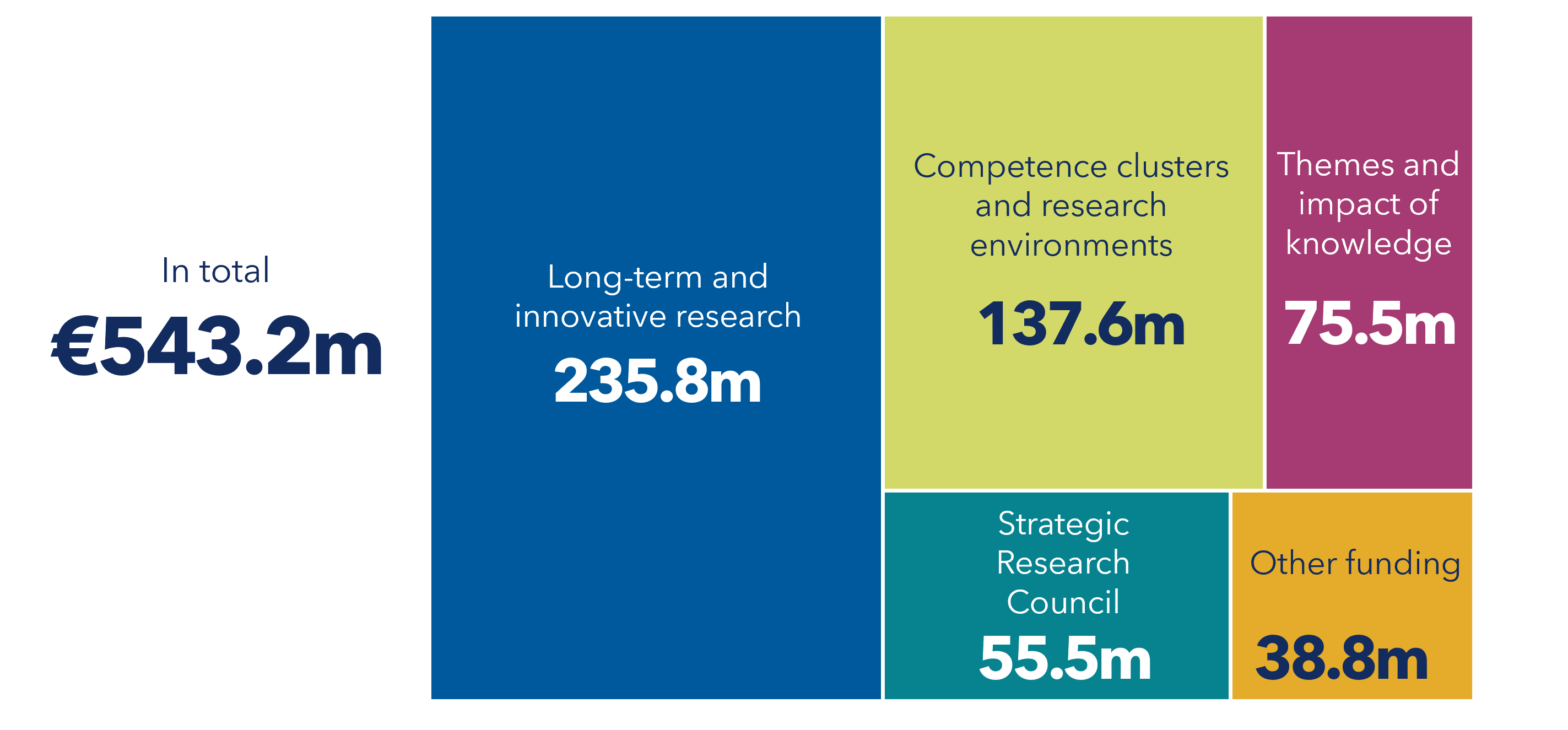 *The total sum (€543m) includes the Strategic Research Council’s (SRC) proportion, approx. 55 million euros.