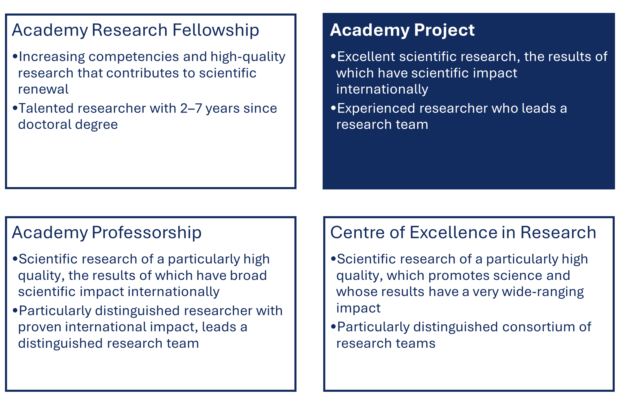 The Academy Project call will also be examined as part of the RCF's overall funding portfolio and especially in relation to other calls where long-term research, scientific renewal and excellence are at the core. Such calls include the Academy Research Fellowships, the Academy Professorships and the Finnish Centre of Excellence Programmes. Our longer-term goal is to eliminate unnecessary overlaps between the objectives of different calls and to clarify at which types of applicants or applicant groups they are targeted.