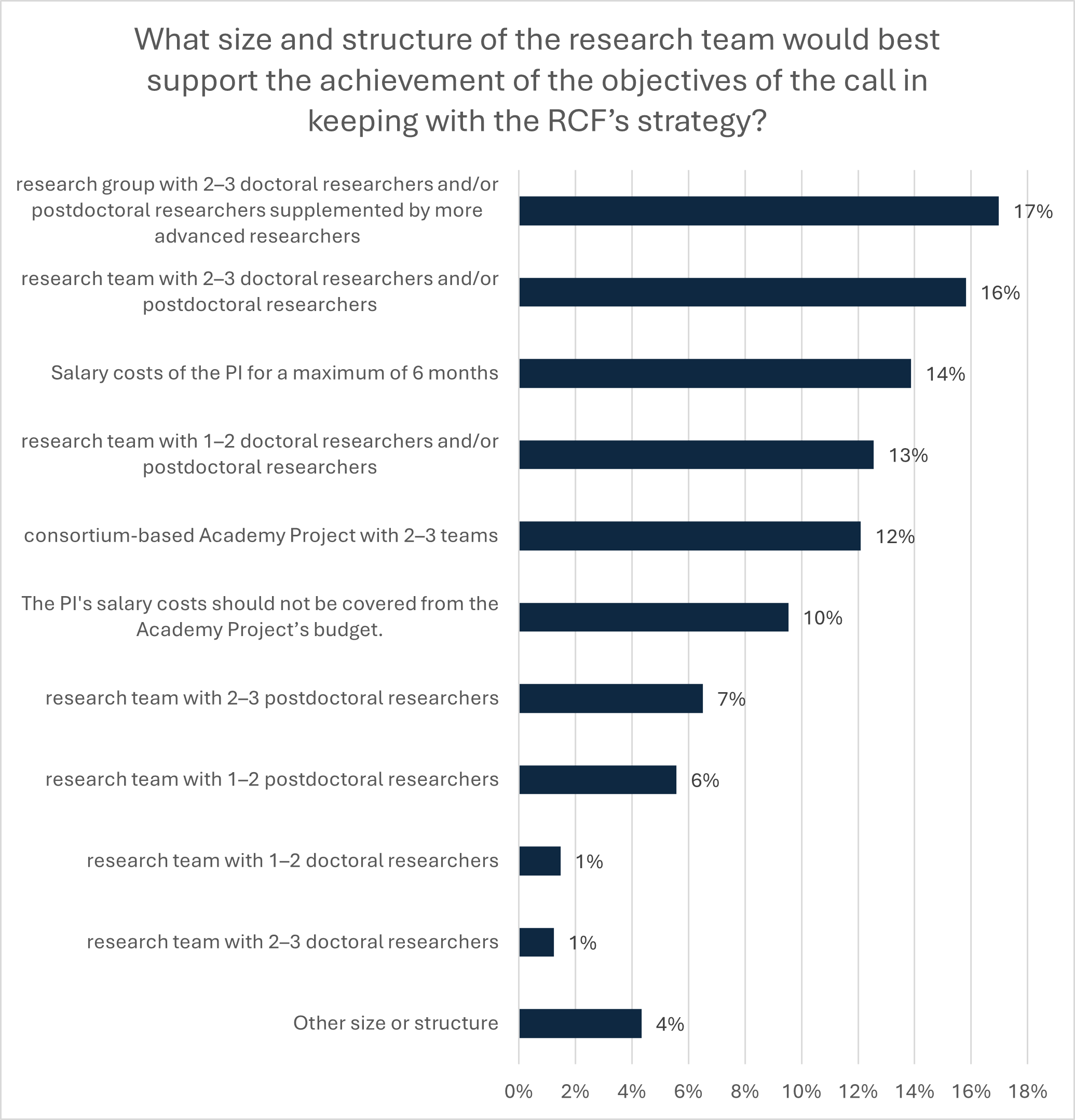 The respondents were also asked about their views on the duration and amount of Academy Project Funding, and about the appropriate structure of the research team. Around half of the respondents considered the current level of funding appropriate, but almost as many (44%) felt the level was too low. More than two-thirds of respondents would not raise the funding amount per individual project if this meant a reduction in the current success rate. The majority of respondents considered the current four-year funding period to be appropriate. Respondents hoped that the research teams would be able to recruit both doctoral and postdoctoral researchers.