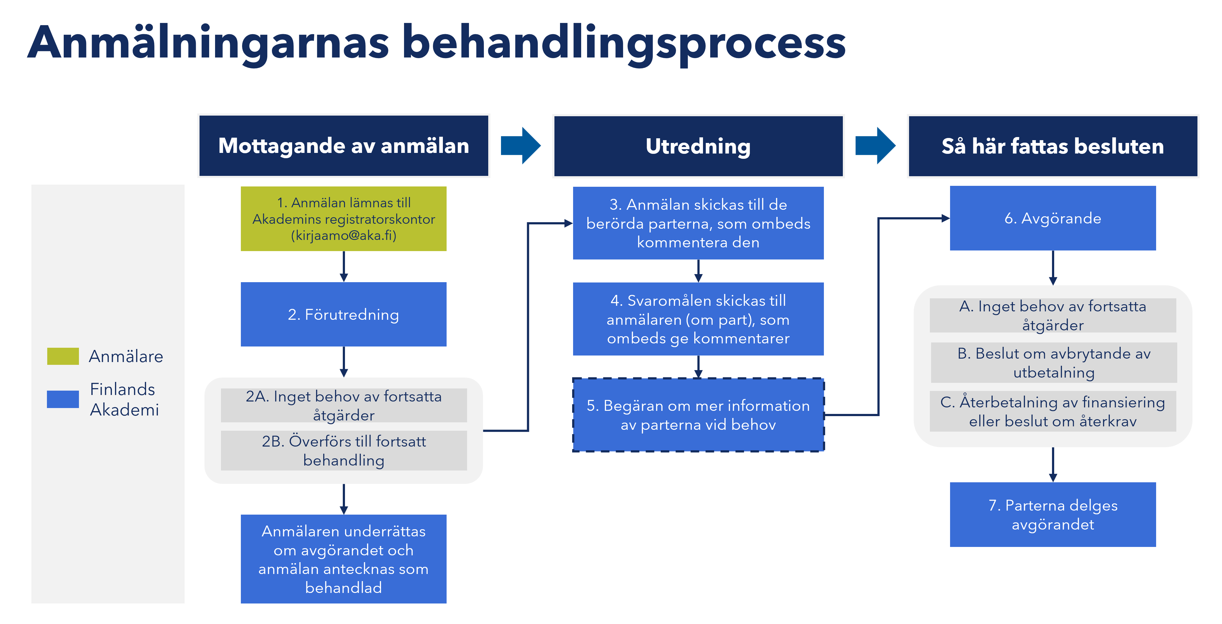 Anmälan kan göras av en person som arbetar inom projektet, en representant för forskningsplatsen eller någon annan person som fått kännedom om saken. Om anmälan leder till fortsatta åtgärder hör Akademin parterna som en del av utredningsprocessen. Hörandet innebär att den ursprungliga anmälan skickas till parterna och att de kan ge svaromål på den.