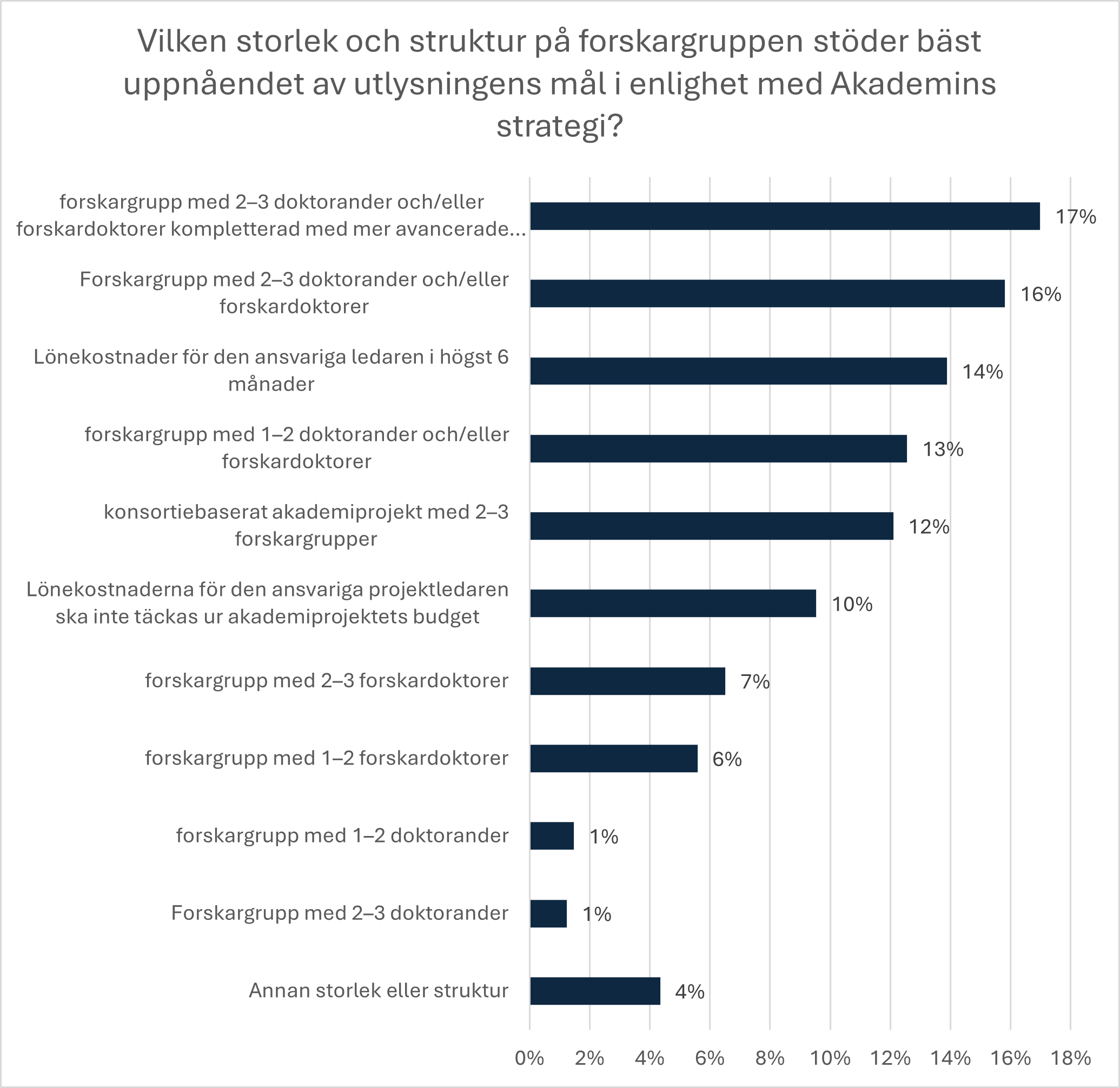 Figuren nedan visar fördelningen av svaren vad gäller den optimala storleken och strukturen på forskargruppen i akademiprojekt.