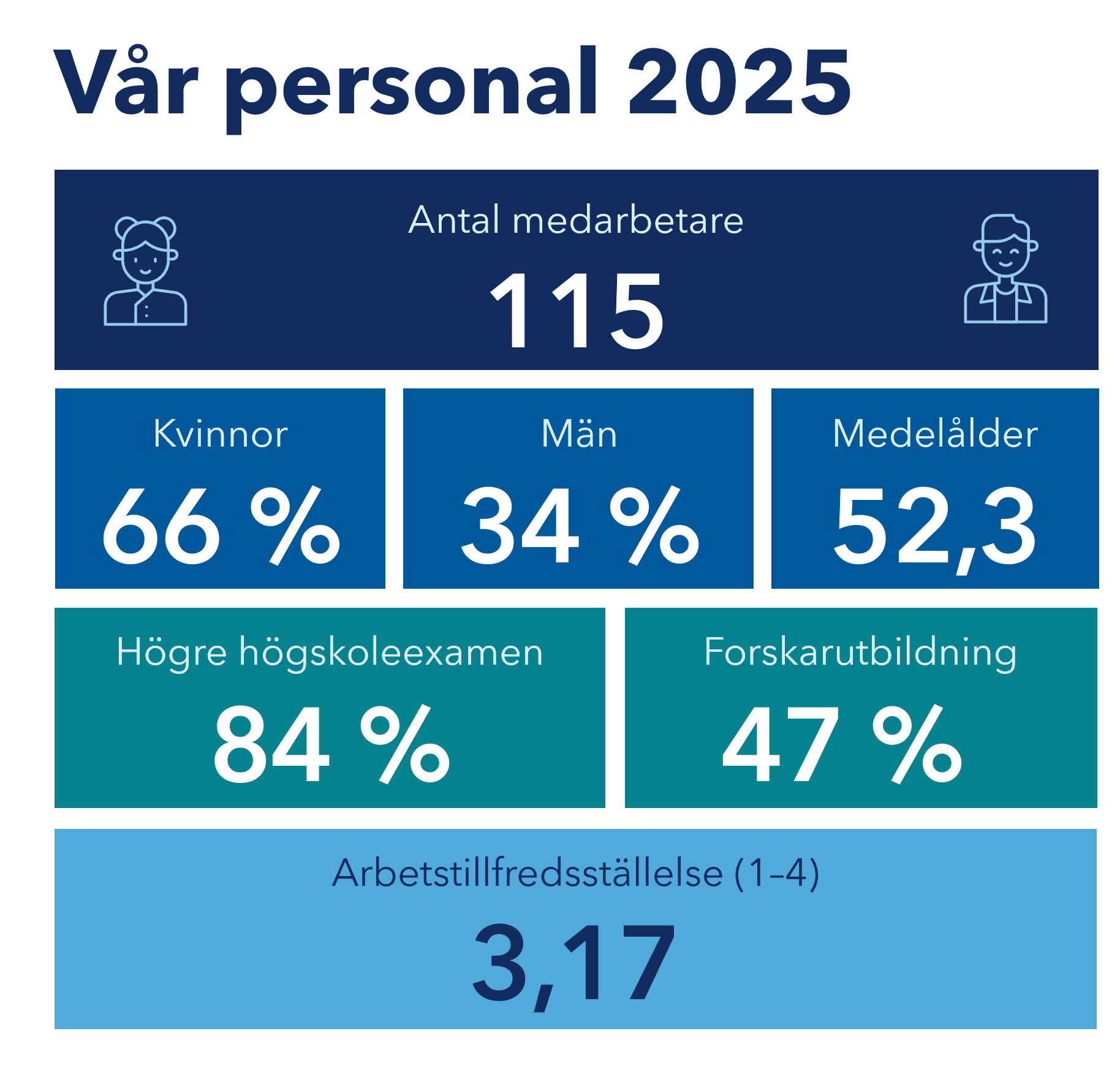 Vårt mål som arbetsgivare är att personalen är kompetent och välmående samt att de trivs i sitt arbete. Vi erbjuder personalen utmärkta möjligheter att utveckla sig själv och sin sakkunskap. Ständig utveckling av personalens kompetens och välmående stöder en ansvarsfull, tidsenlig och interaktiv verksamhet i samarbete med forskarsamhället och hela det omgivande samhället.