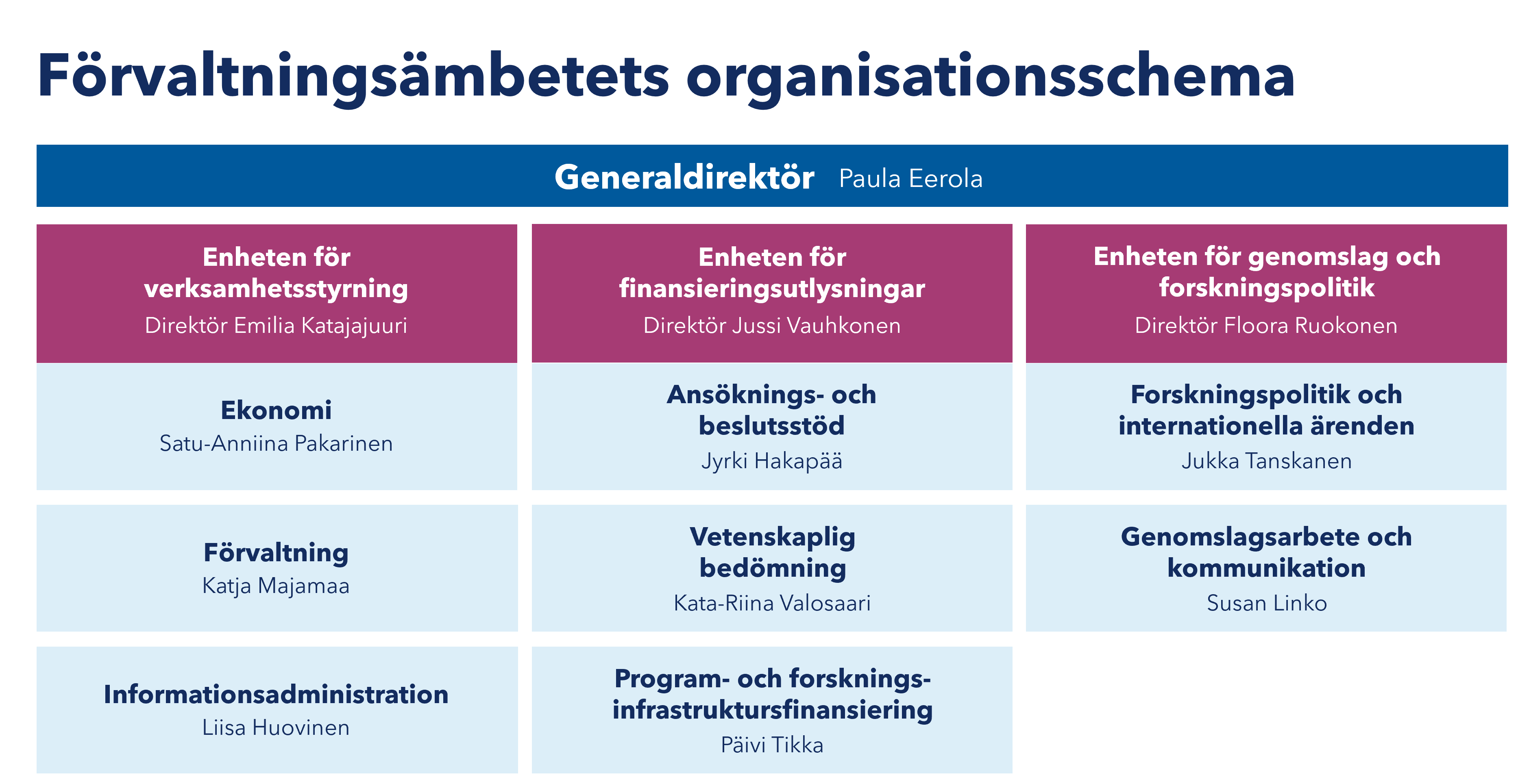 Generaldirektören leder det dagliga arbetet vid förvaltningsämbetet. Förutom generaldirektören består den högsta ledningen av enhetsdirektörerna. Vid Akademin finns tre enheter: