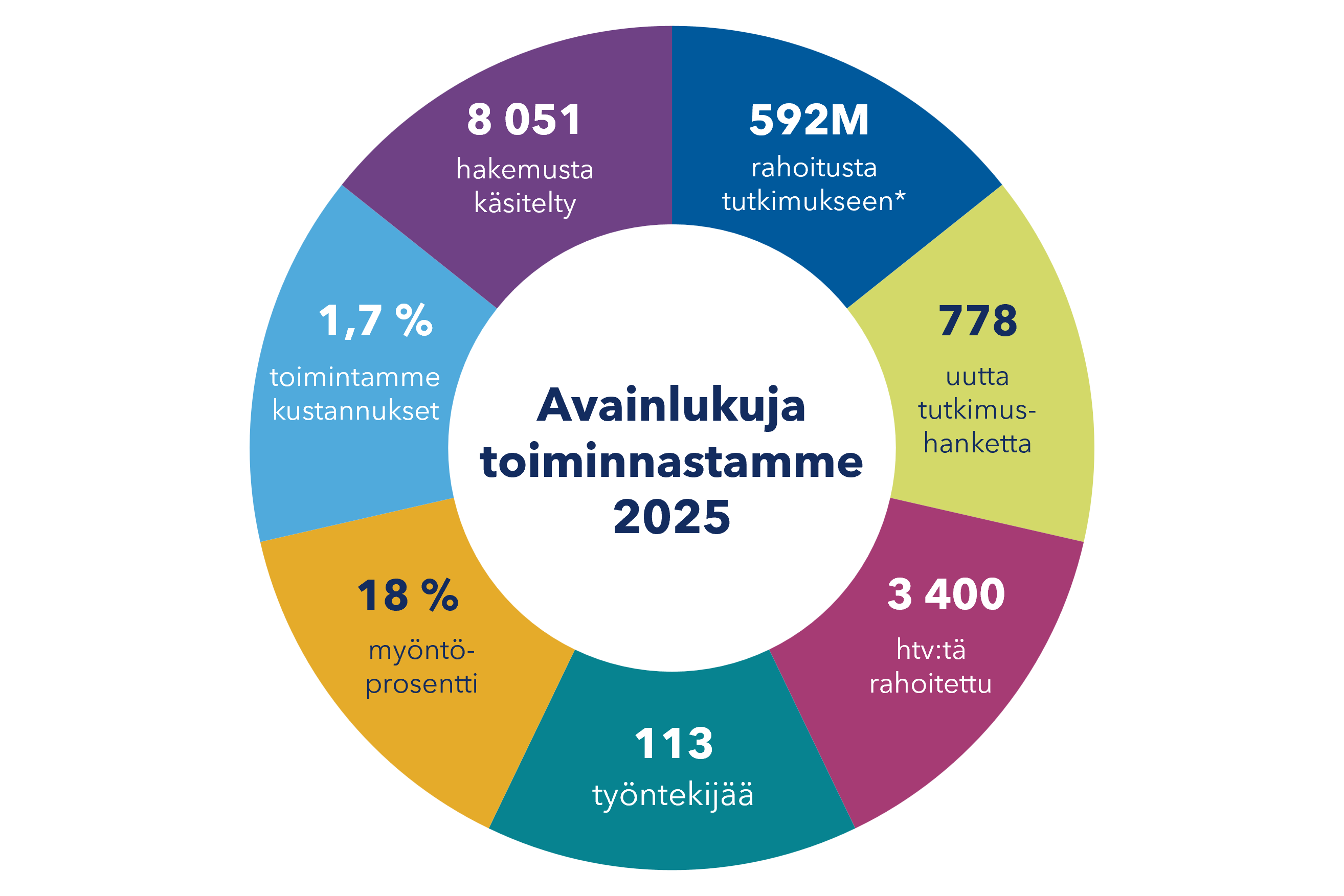 Vuonna 2025 rahoitimme tutkimusta noin 592 miljoonalla eurolla (ml. strategisen tutkimuksen neuvoston osuus noin 50 miljoonaa euroa). Tämä mahdollisti jopa 3 400 henkilön (htv) tutkimustyön Suomen yliopistoissa ja tutkimuslaitoksissa.