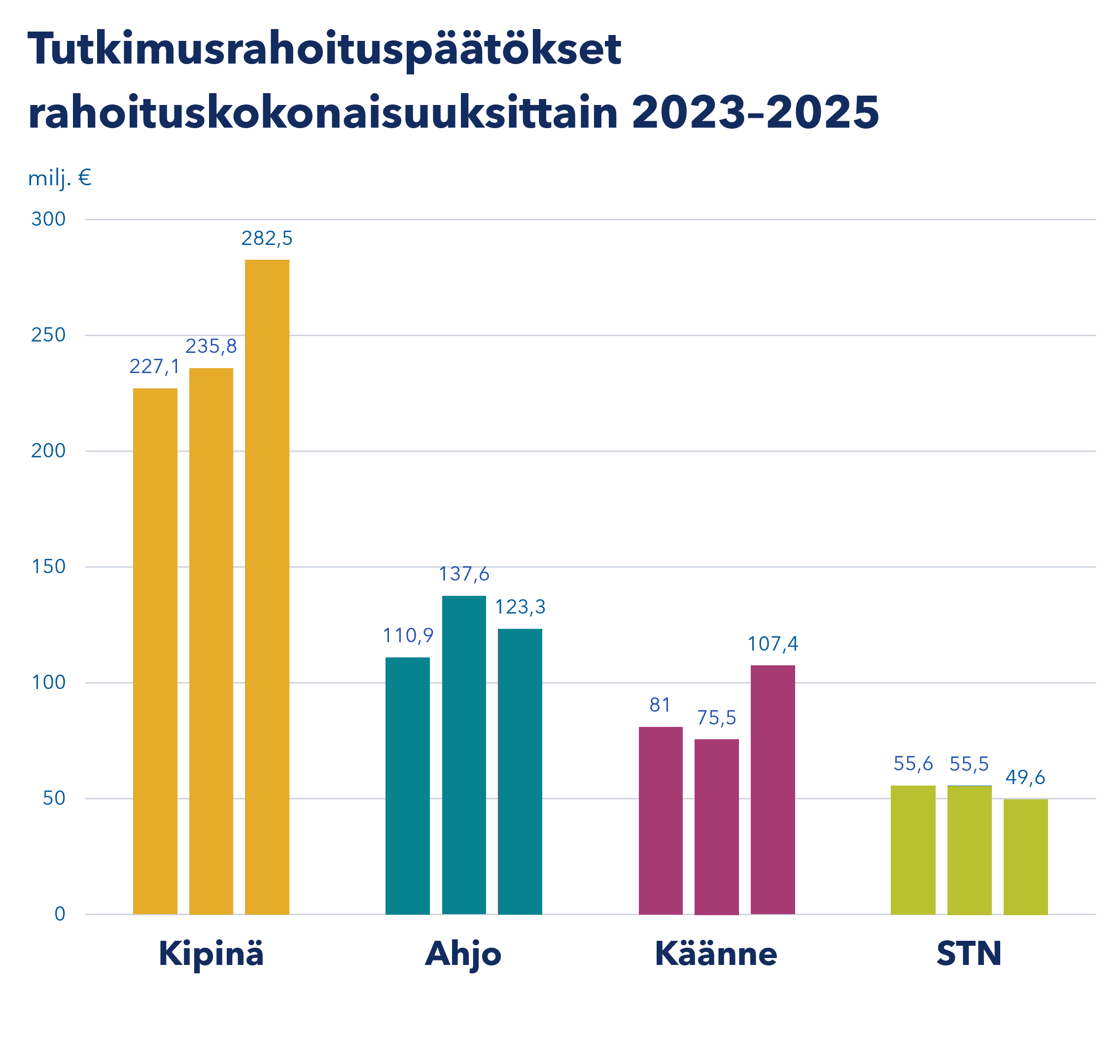 Rahoituksemme koostuu Kipinä-rahoituksesta, jolla tuetaan parhaimpia tiedeyhteisöstä kumpuavia uusia tutkimusaloitteita, Ahjo-rahoituksesta, jolla vahvistetaan kilpailukykyisimpiä tutkimusympäristöjä ja -infrastruktuureja, sekä Käänne-rahoituksesta, jonka kautta edistämme tutkimuksesta kumpuavaa käännettä suomalaisen yhteiskunnan eri tarpeista lähtien.