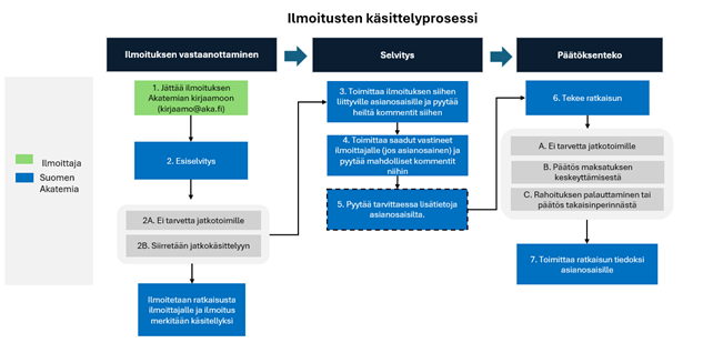 Ilmoituksen voi tehdä hankkeessa työskentelevä henkilö, suorituspaikan edustaja tai muu asian tietoonsa saanut henkilö. Mikäli ilmoitus johtaa jatkotoimenpiteisiin, Akatemia kuulee asianosaisia osana selvitysprosessia. Kuuleminen sisältää sen, että alkuperäinen ilmoitus lähetetään asianosaisille ja he voivat antaa siihen vastineen.